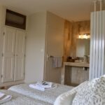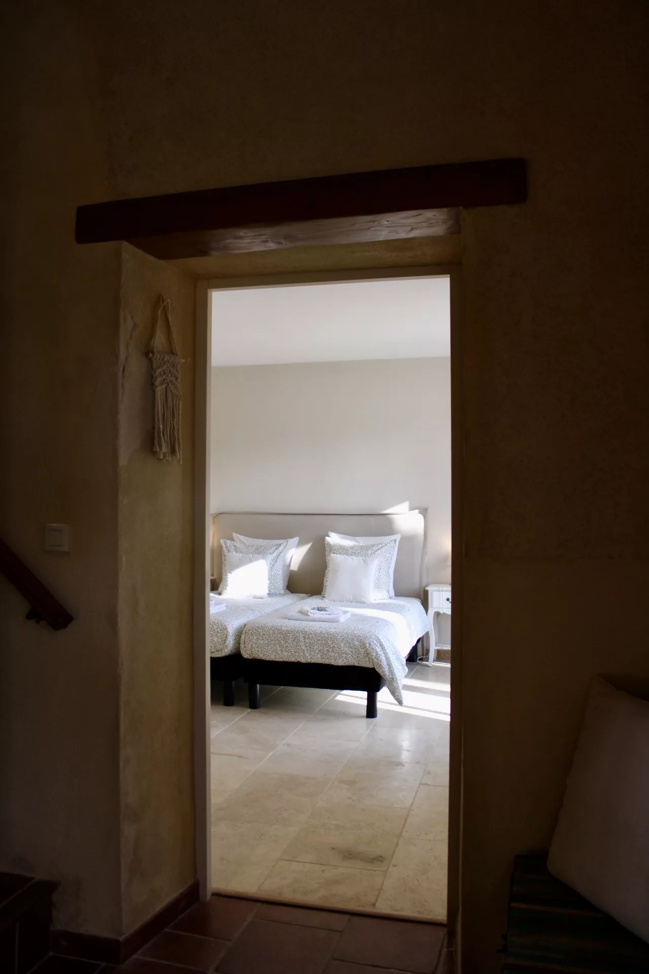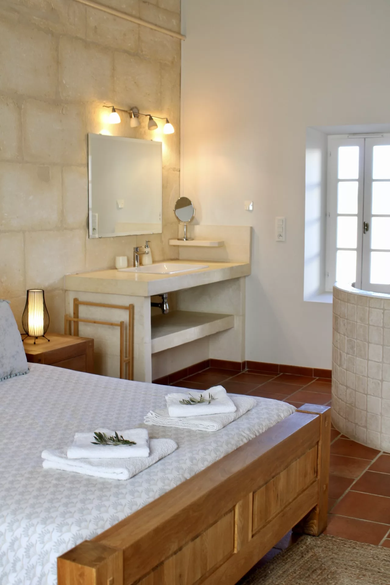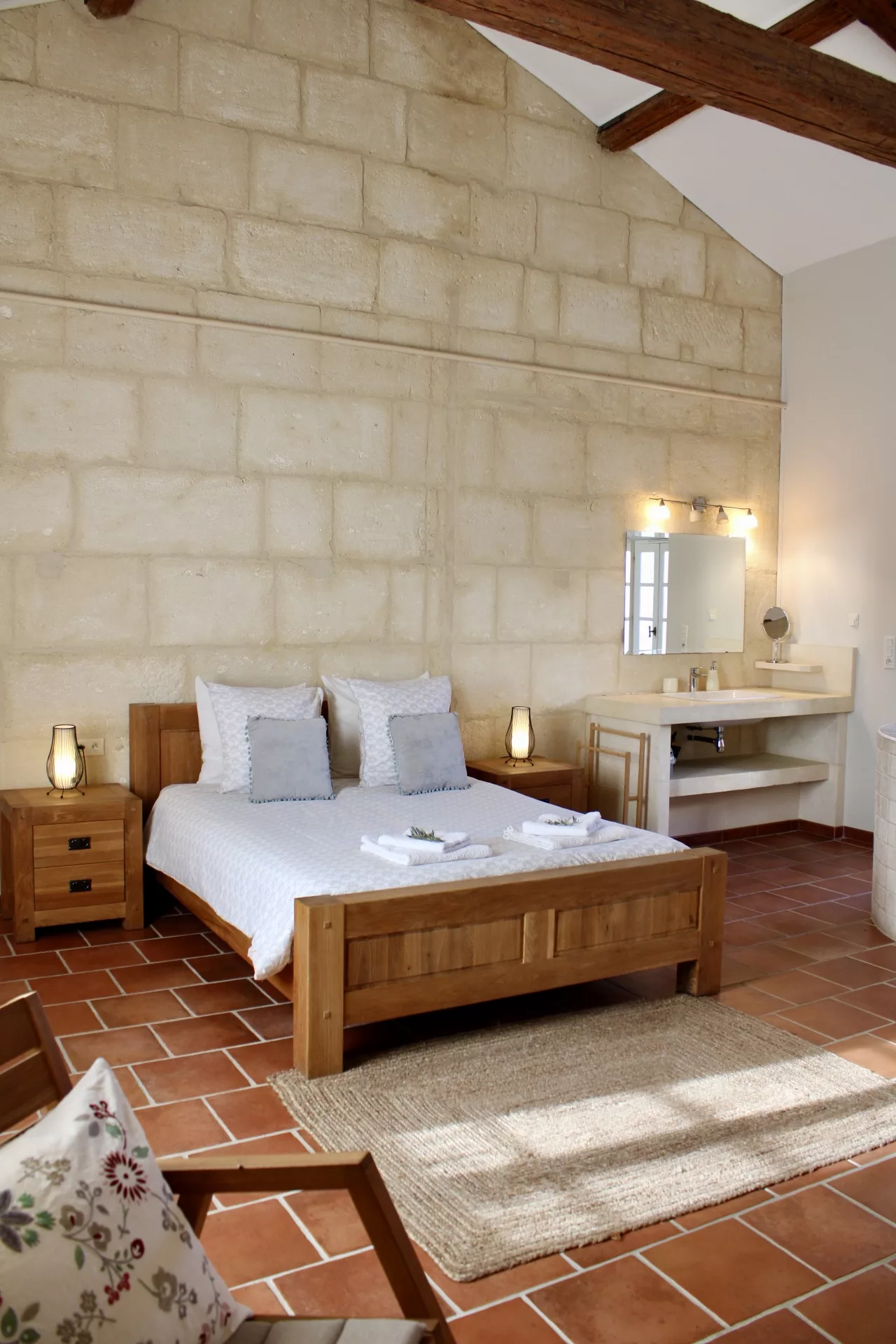 Côté étage, un splendide espace, une grande chambre XXL, façon loft, avec une literie de qualité dans un lit Queen-size, ouverte sur sa salle d’eau originale, vous accueille. Le mélange murs en pierre, rambarde en fer forgé et mobilier en bois brut apportent ici un effet chaleureux que nous recherchions. Dotée de belles hauteurs particulièrement appréciables en été, elle jouit d’une jolie vue dont on ne se lasse pas dès le réveil