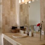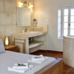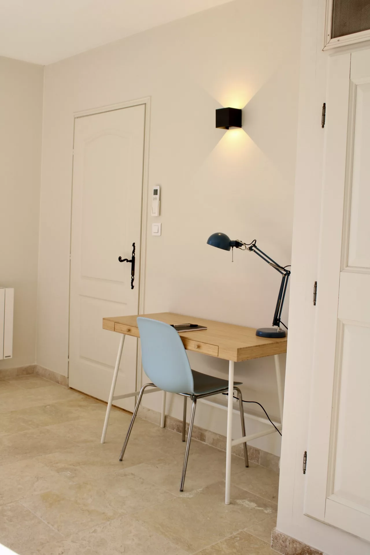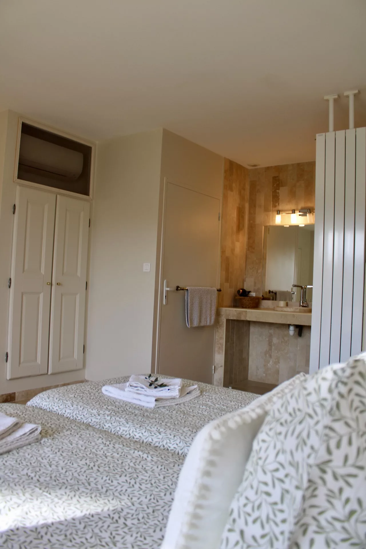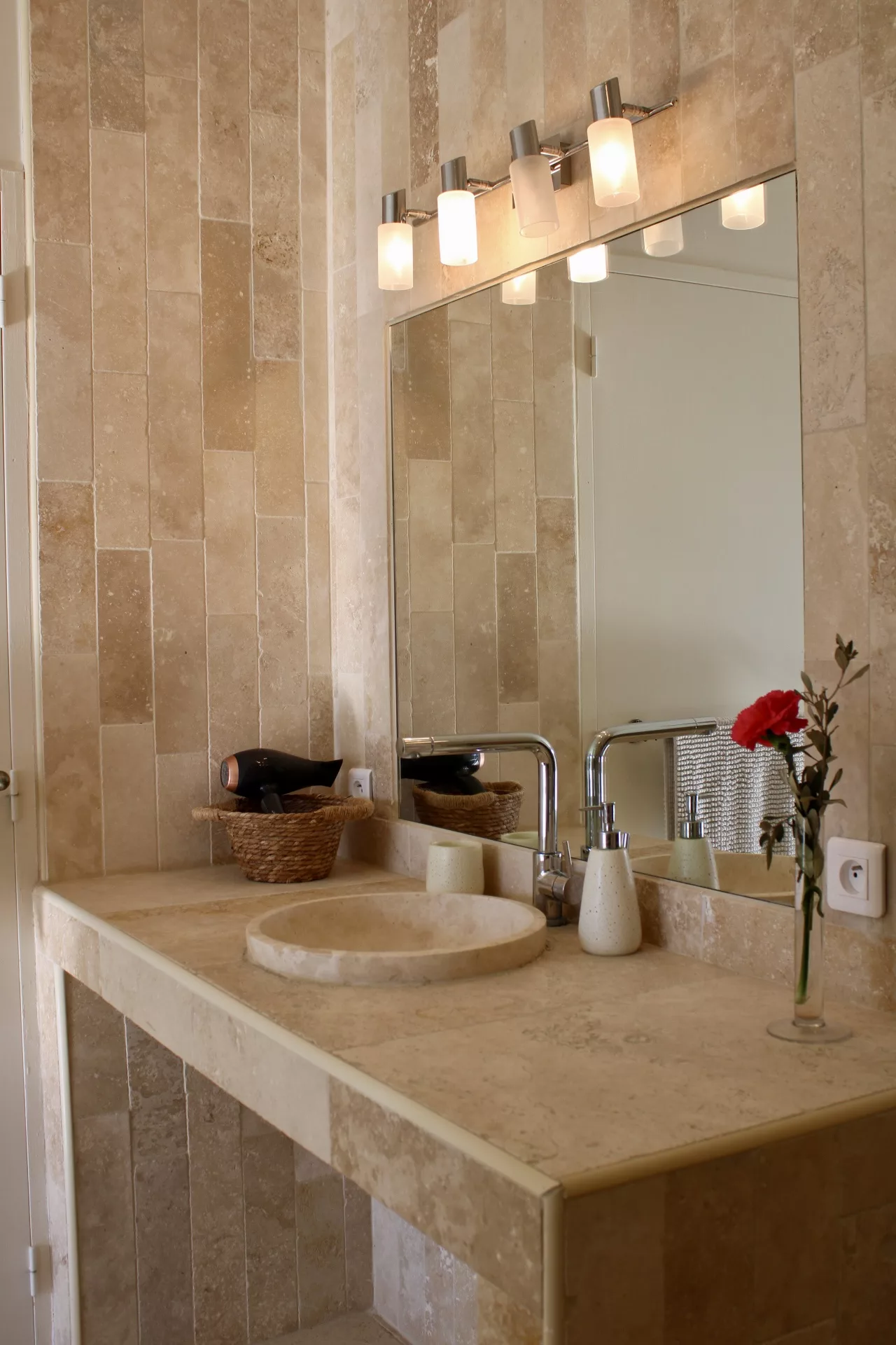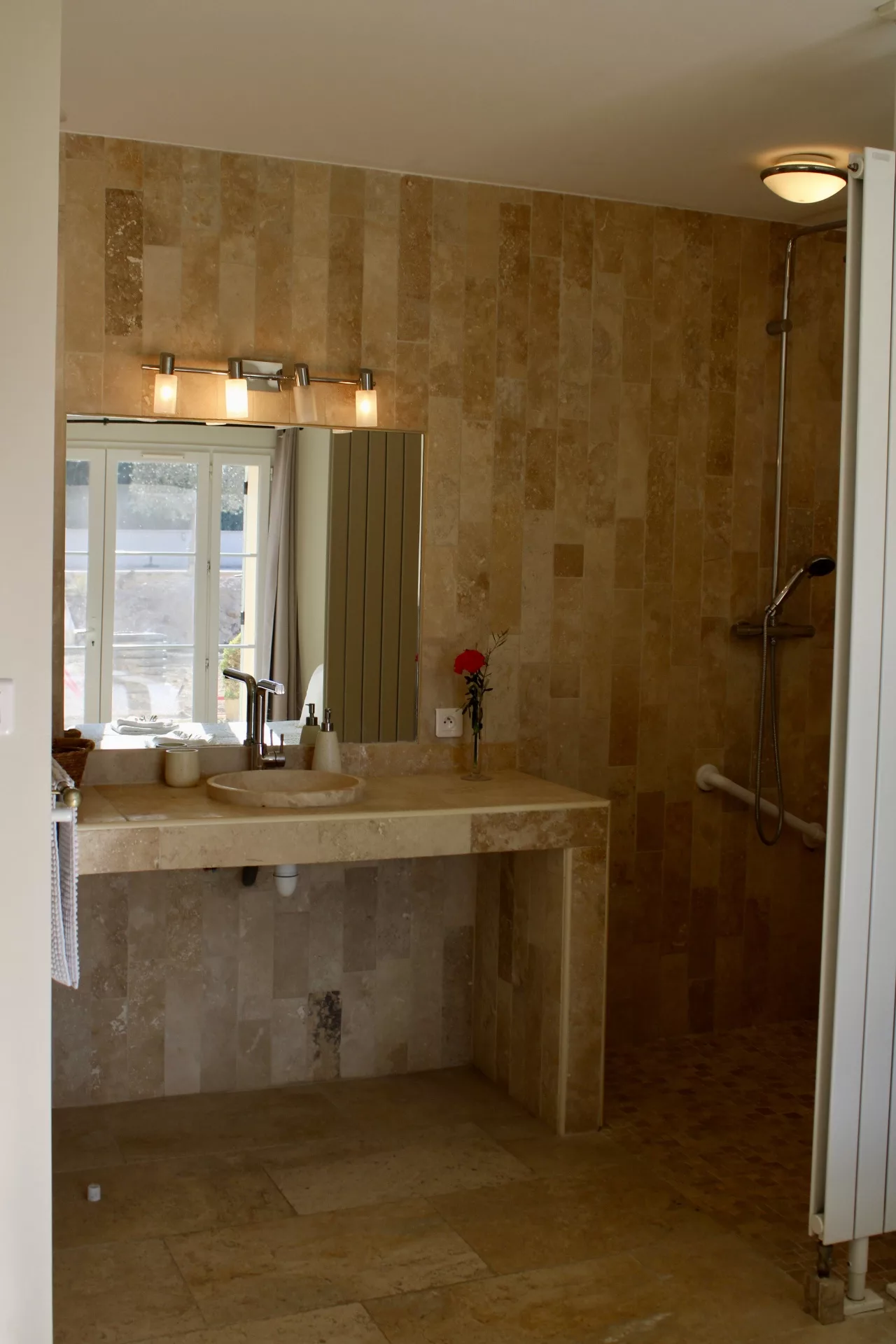 Au rdc également, une chambre séparée, conçue pour pouvoir accueillir des personnes à mobilité réduite. L’autre particularité : c’est l’intégration de sa salle d’eau avec douche aux couleurs naturelles, travertin au mur (vous savez ce matériau qui incarne l’été …) et vasque en pierre qui viennent souligner l’esprit méditerranéen de l’ensemble.