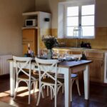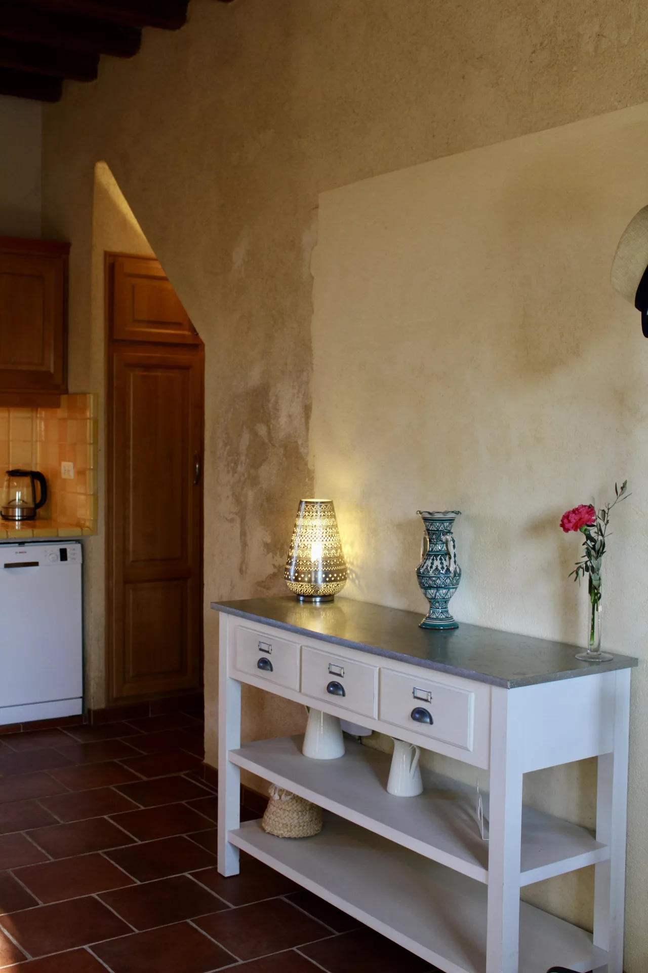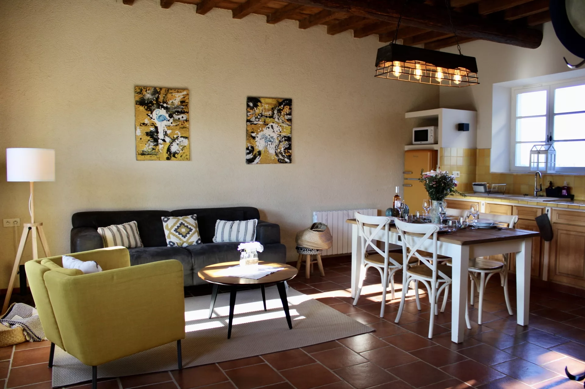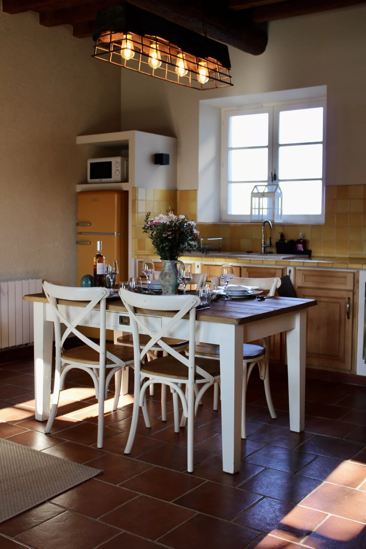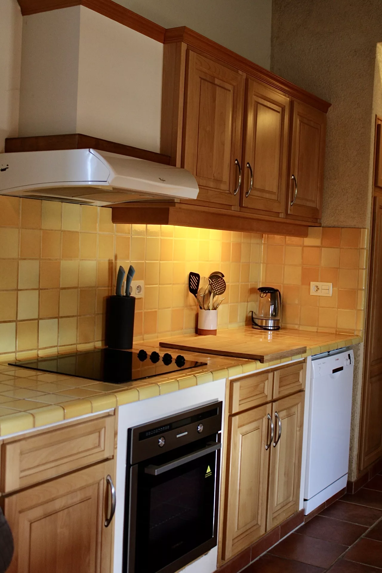 La cuisine entièrement équipée rayonne de ses couleurs solaires.