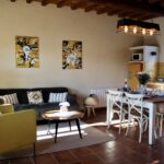 Au rdc un salon avec canapé et fauteuil fusionne avec le coin repas.