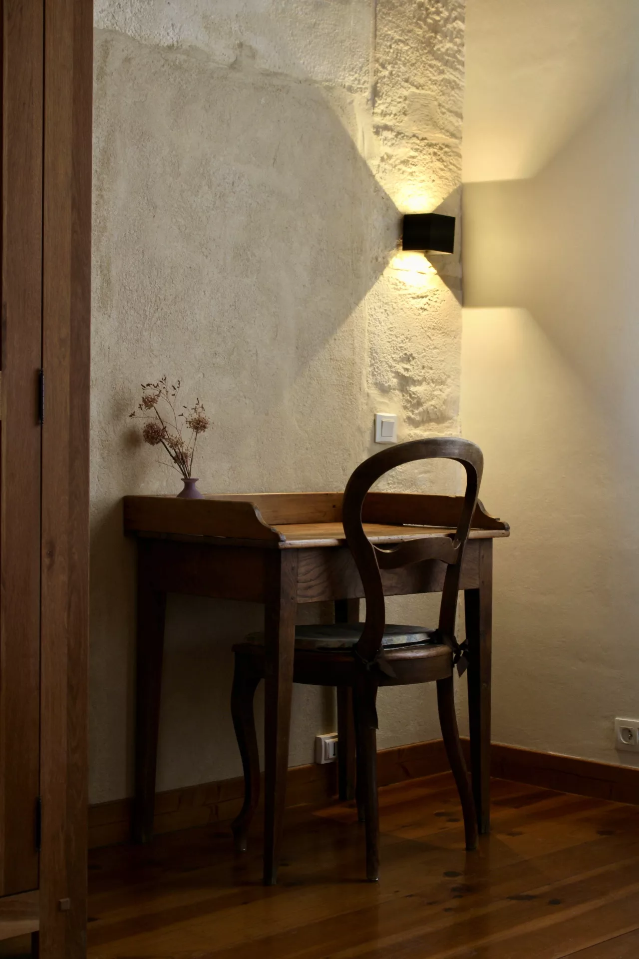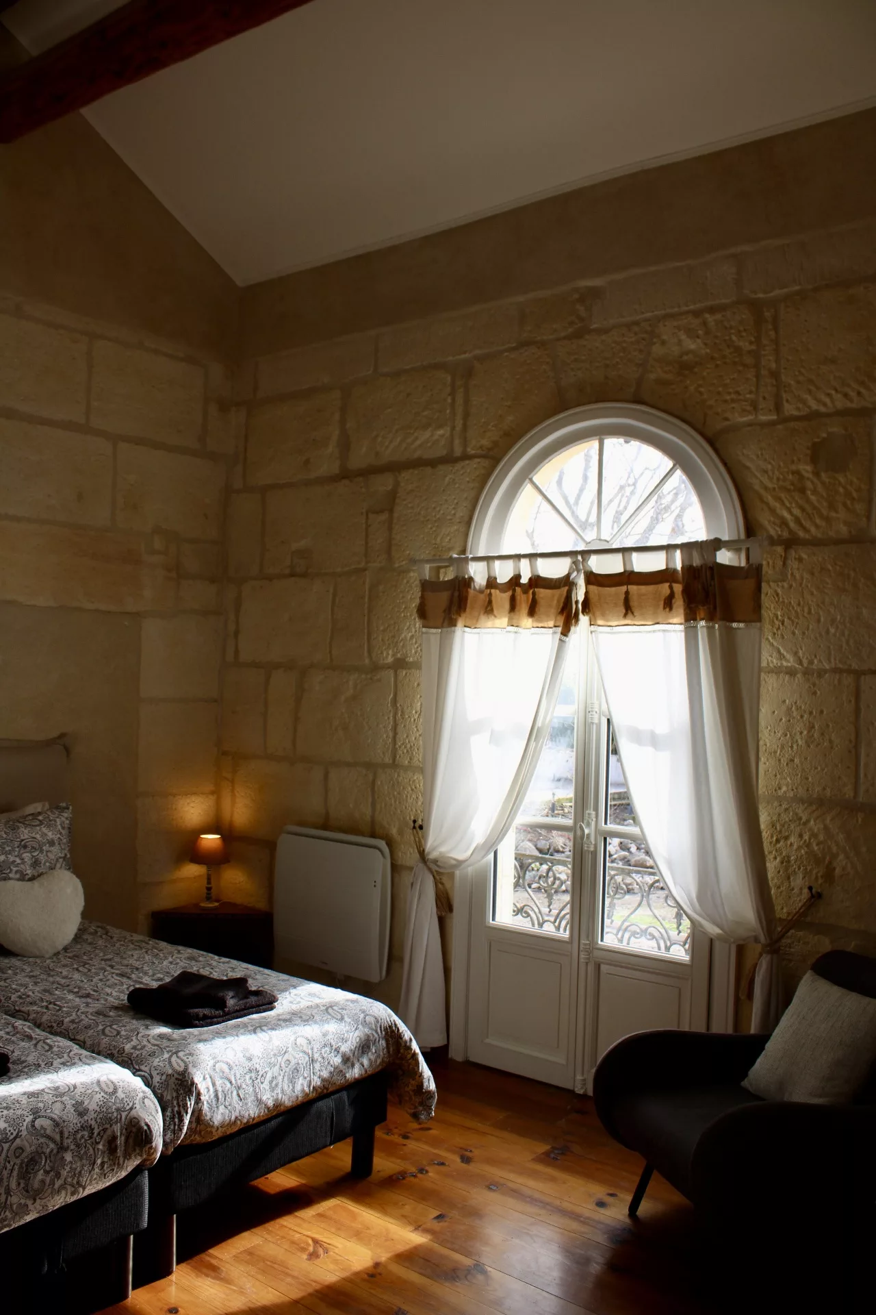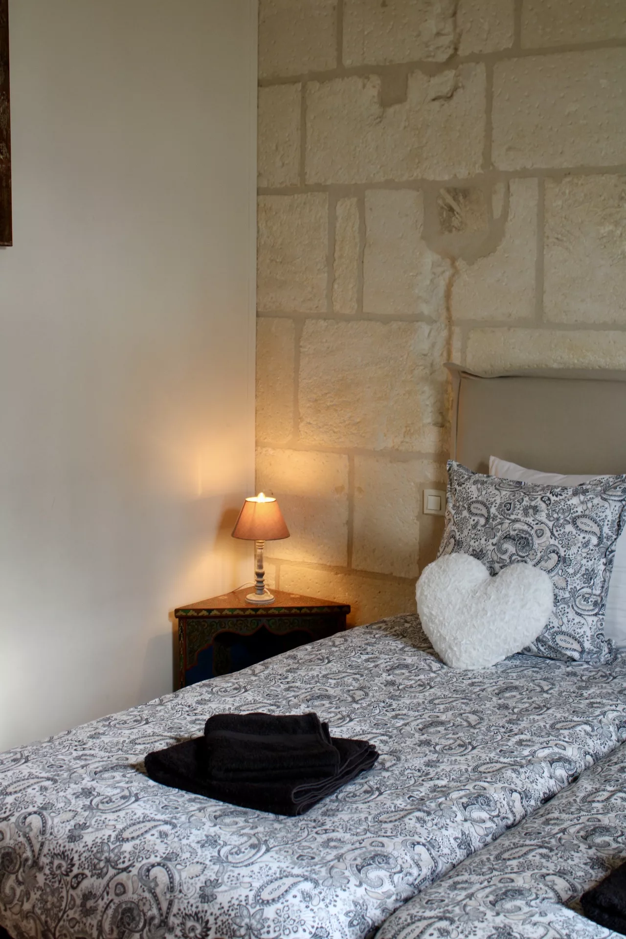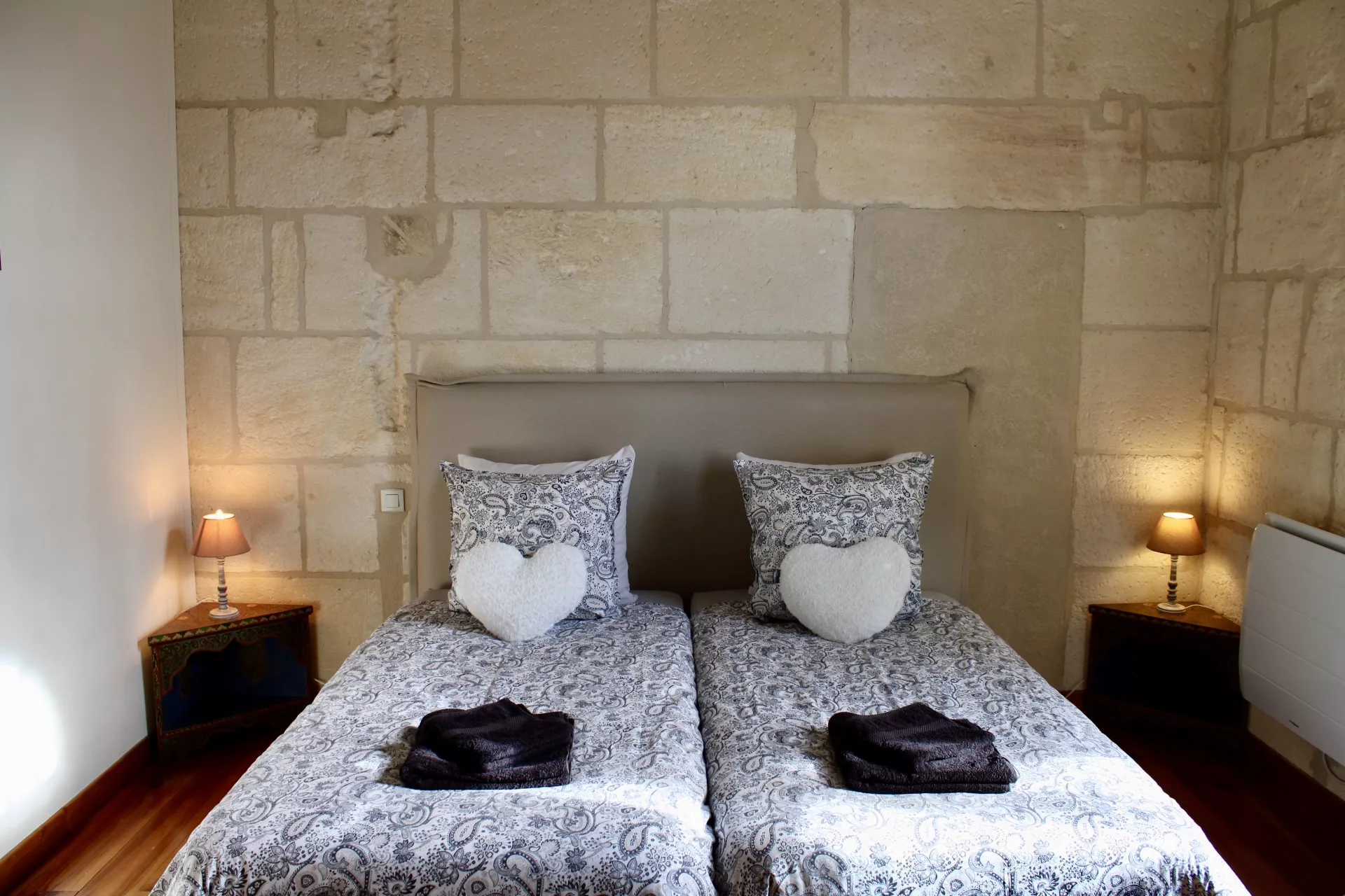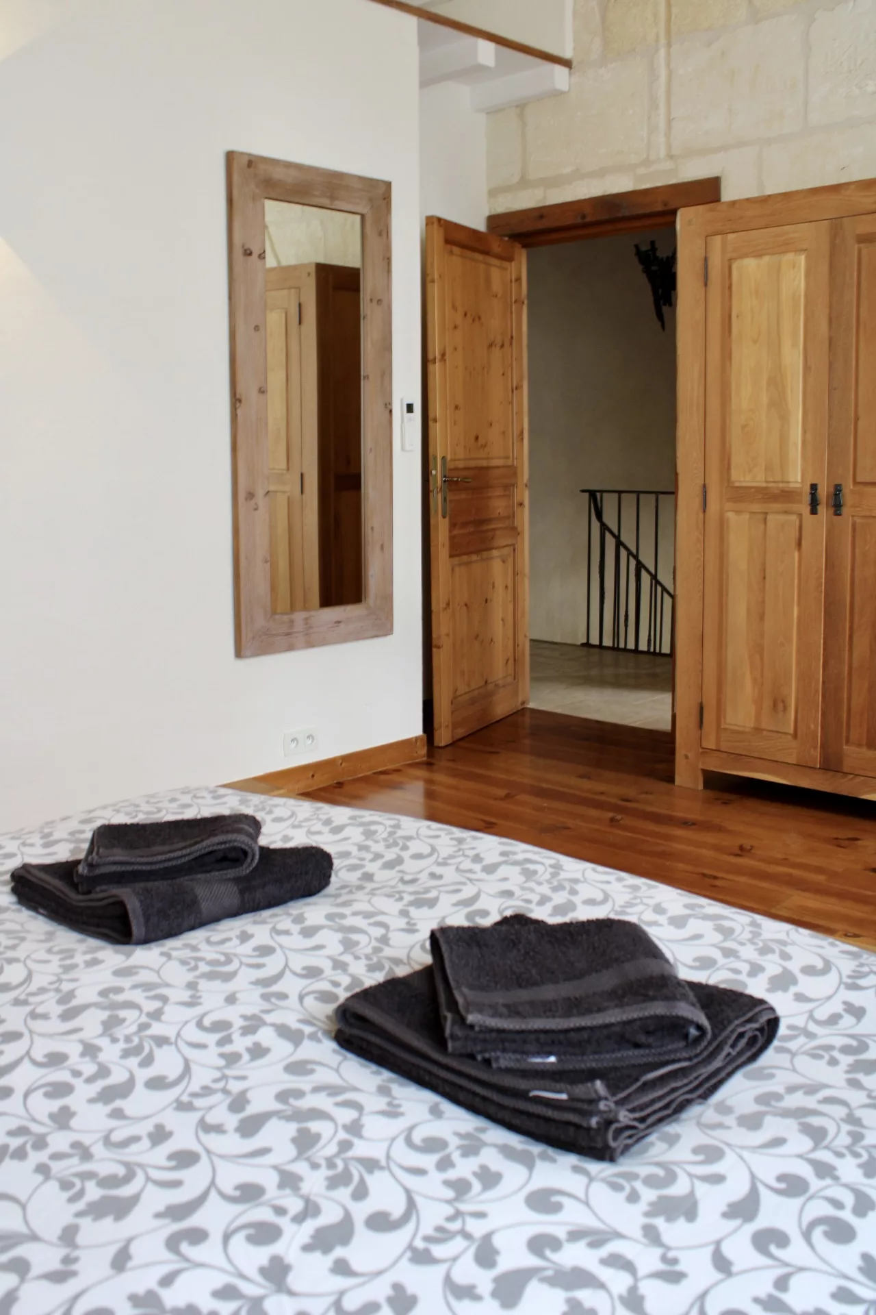 L’escalier en pierre d’origine, mène vers les chambres : Deux chambres confortables au parquet de bois ancien, de belles hauteurs sous le plafond et literie de qualité. Une avec un lit Queen-size d’une largeur de 160cm, la deuxième avec deux lits simples de 90x190cm.