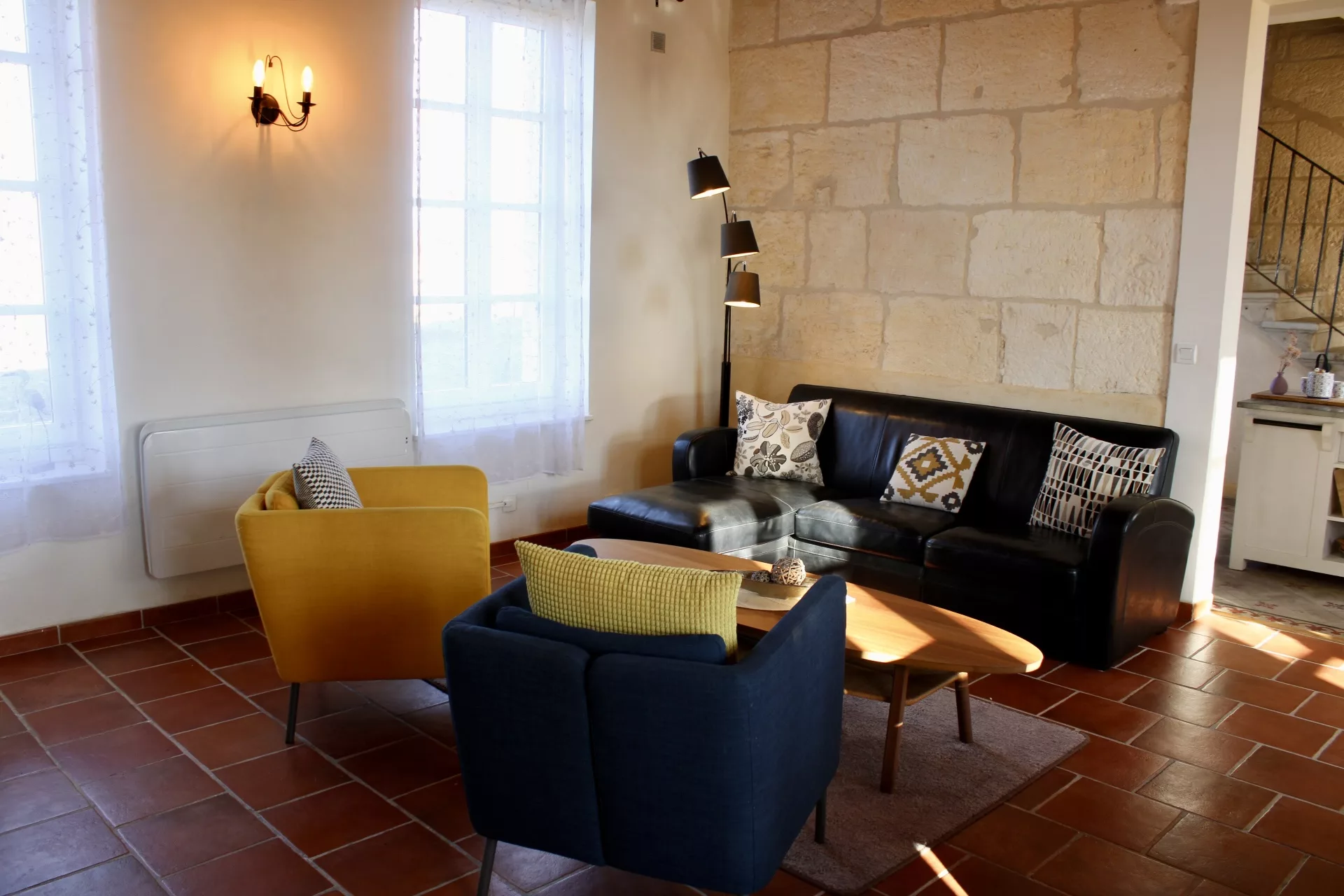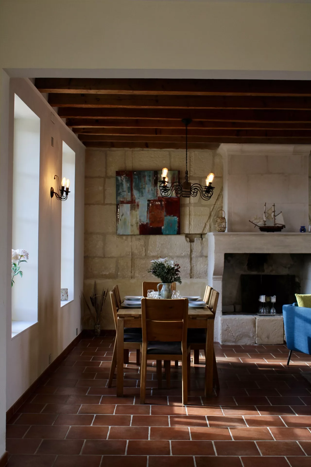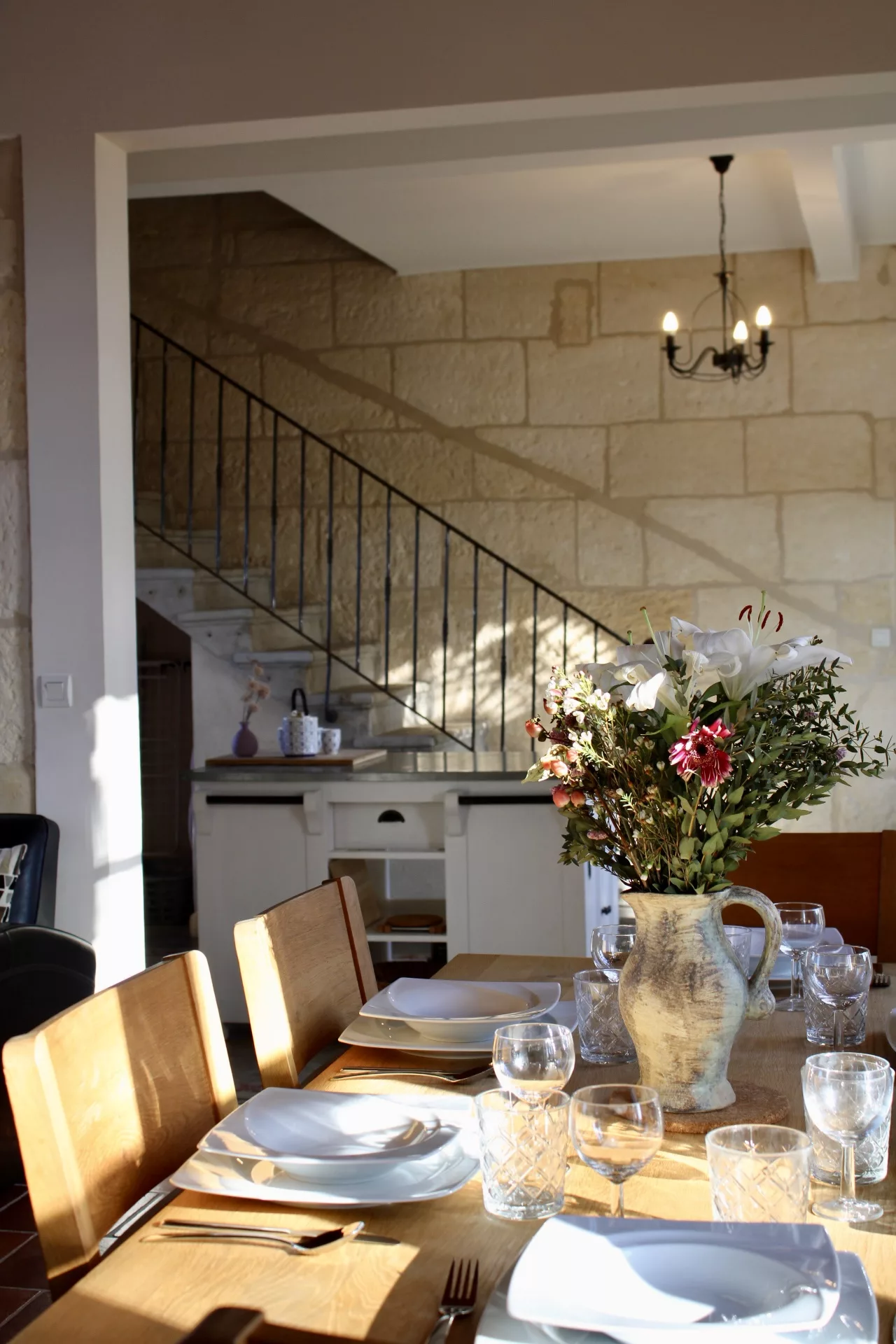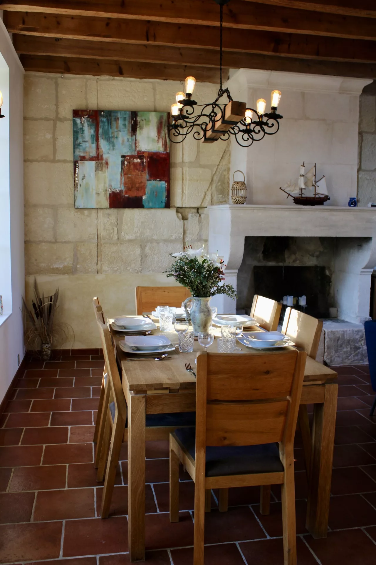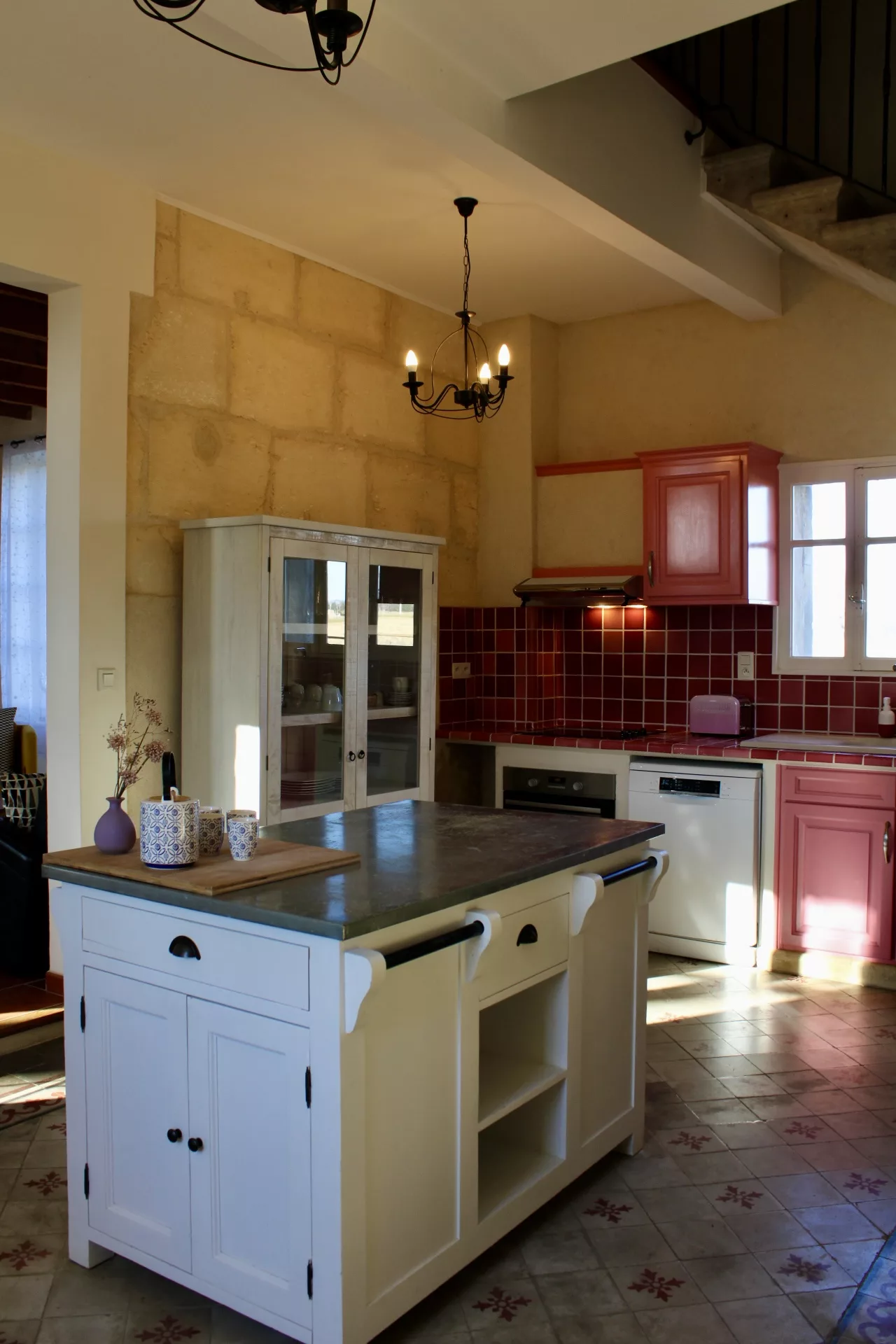 Mais… une fois sur place vous nous confirmerez que les vieux carreaux ciment aux motifs de couleur « rose » ne vous laissent pas indifférents. Avec une telle personnalité ils créent une si belle harmonie avec le reste de la pièce ! À la fois fonctionnelle et entièrement équipée, la cuisine est « THE » lien entre la vie extérieure et intérieure…
